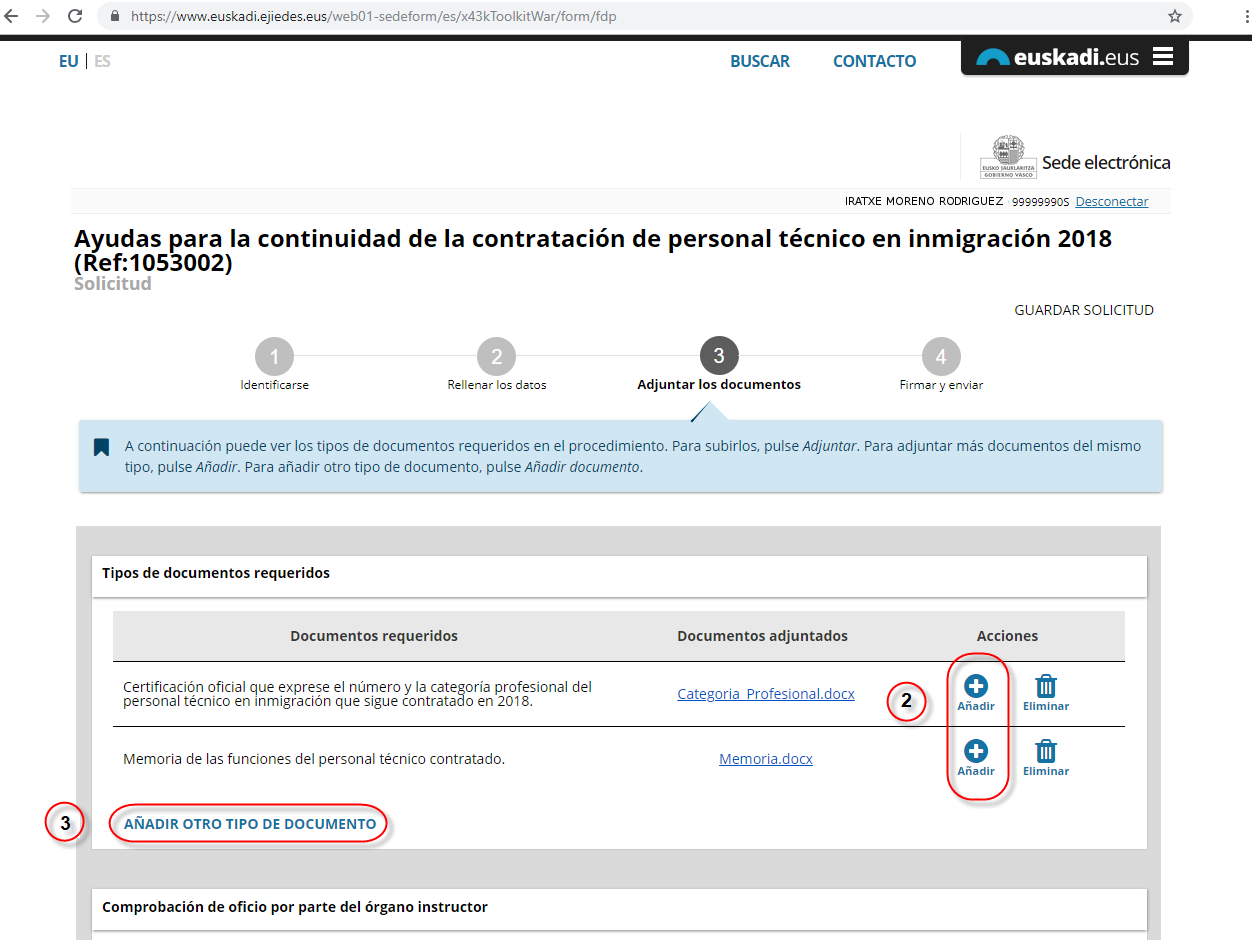 Para adjuntar más documentos del mismo tipo, pulse el icono “Añadir” (2).