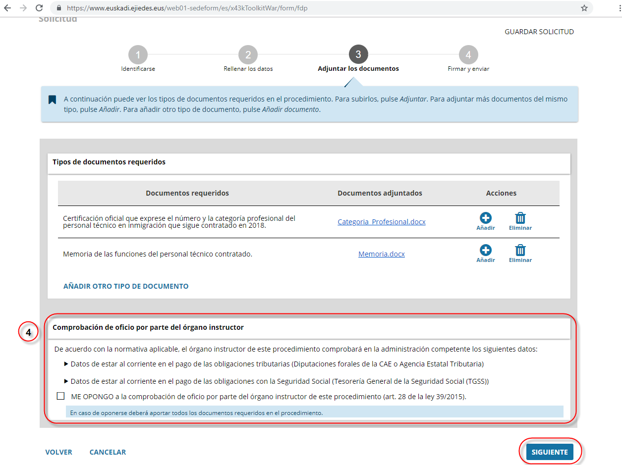 NOTA: Dependiendo de los datos incorporados en el paso anterior (Paso 2. Rellenar los datos), nos requerirán unos documentos u otros.