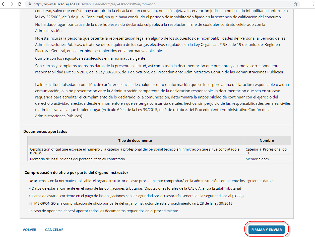 Si se está de acuerdo con los datos introducidos y los documentos aportados, seleccionamos el botón “Firmar y Enviar”.