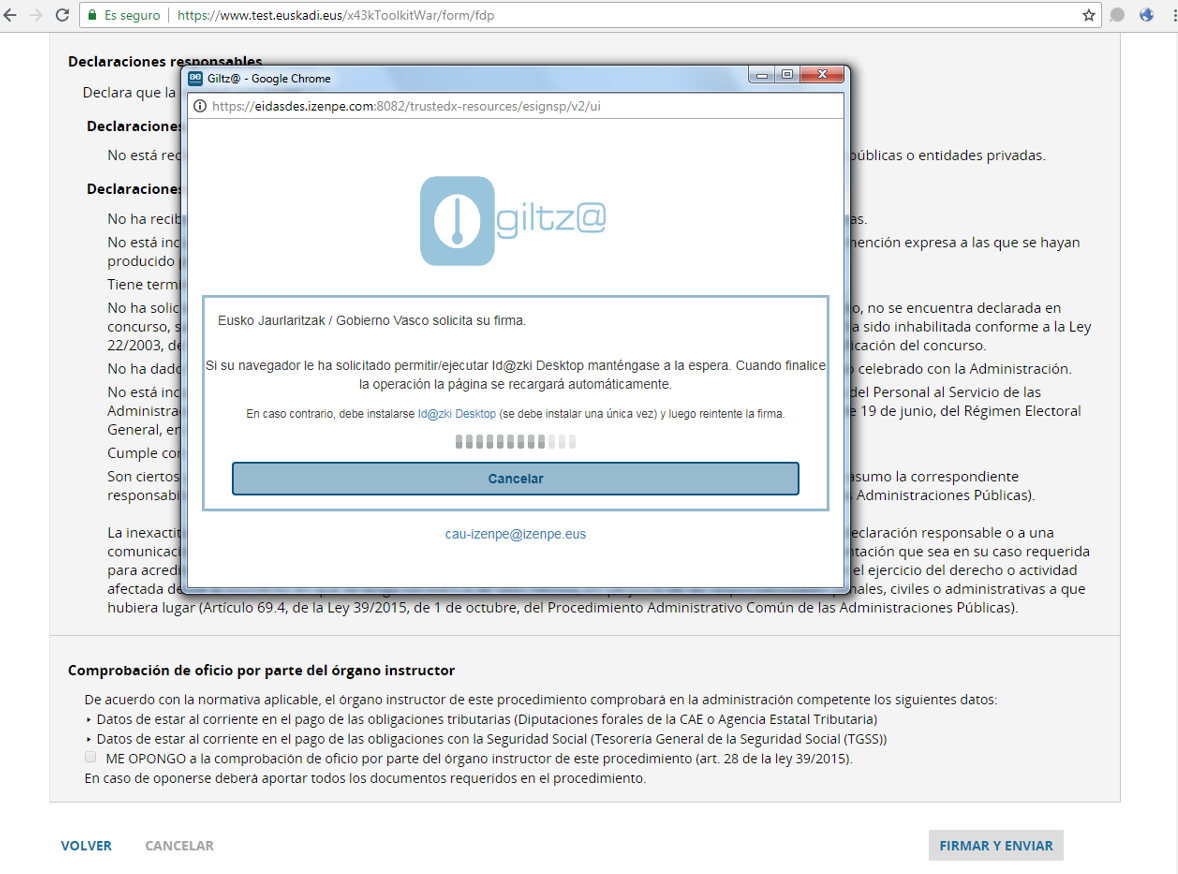 ¡¡IMPORTANTE!! Puede ocurrir que cuando intente firmar la solicitud le aparezca este mensaje. Si es así, debe instalar en su dispositivo electrónico el programa de firma de Izenpe, Id@zki Desktop (esta instalación se realiza una primera y única vez). Una vez instalado el programa, Id@zki Desktop, podrán firmar cualquier solicitud o documento de forma sencilla.