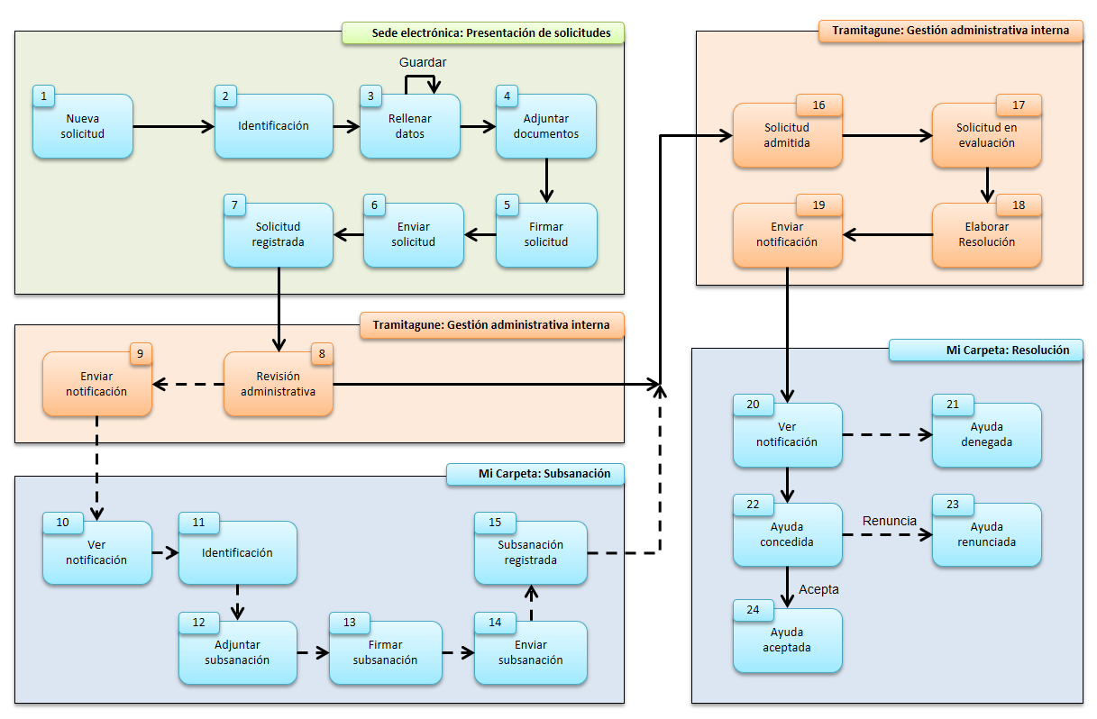 A continuación presentamos el esquema resumen de acciones a llevar a cabo en el proceso de tramitación electrónica (Ejemplo, tramitación de una ayuda)