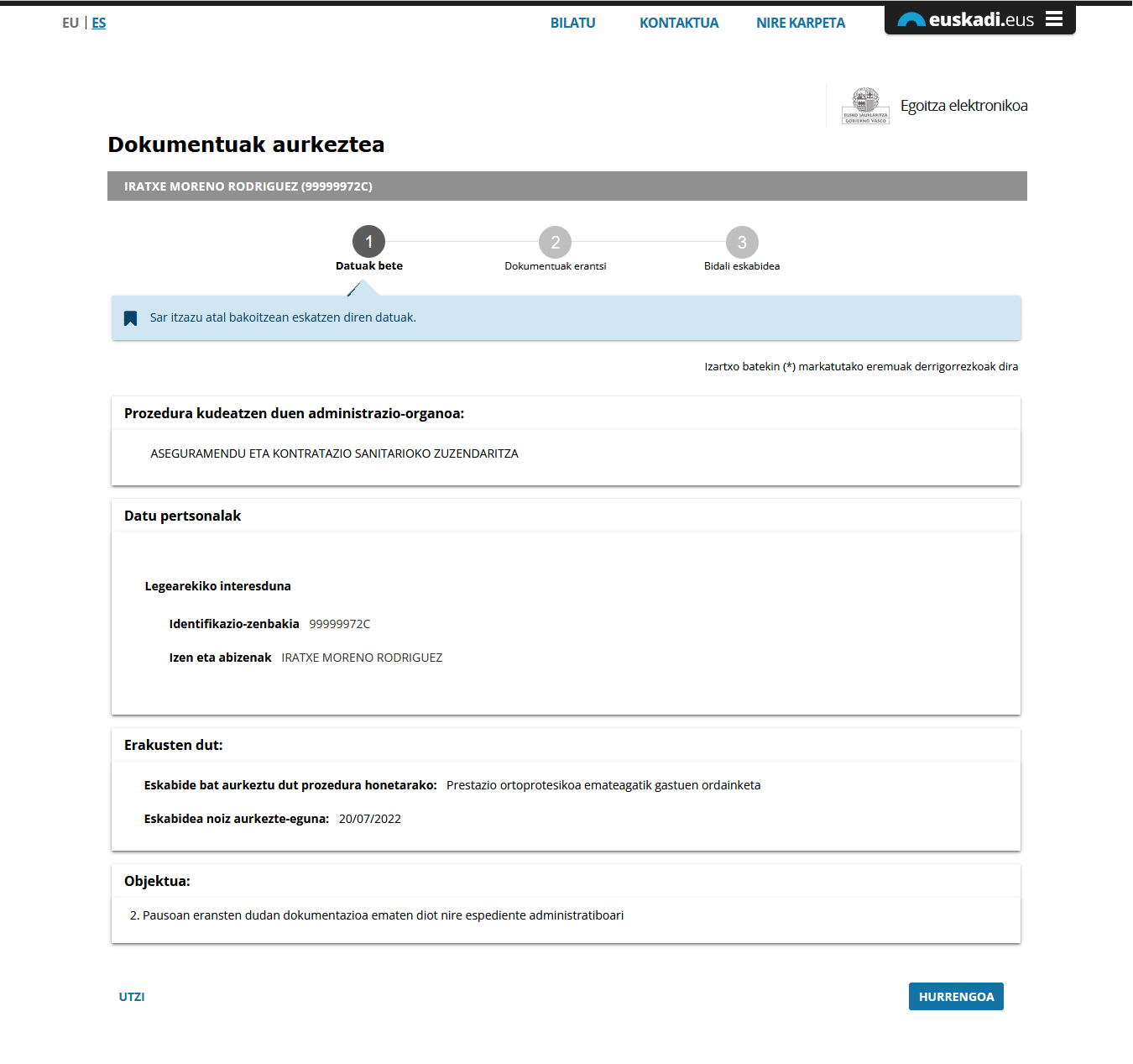 Behin formularioan, 1. urratsak espedienteari buruzko informazioaren laburpena ematen du. Dokumentuak eransteko (2. urratsa), “HURRENGOA” botoia sakatuko dugu.