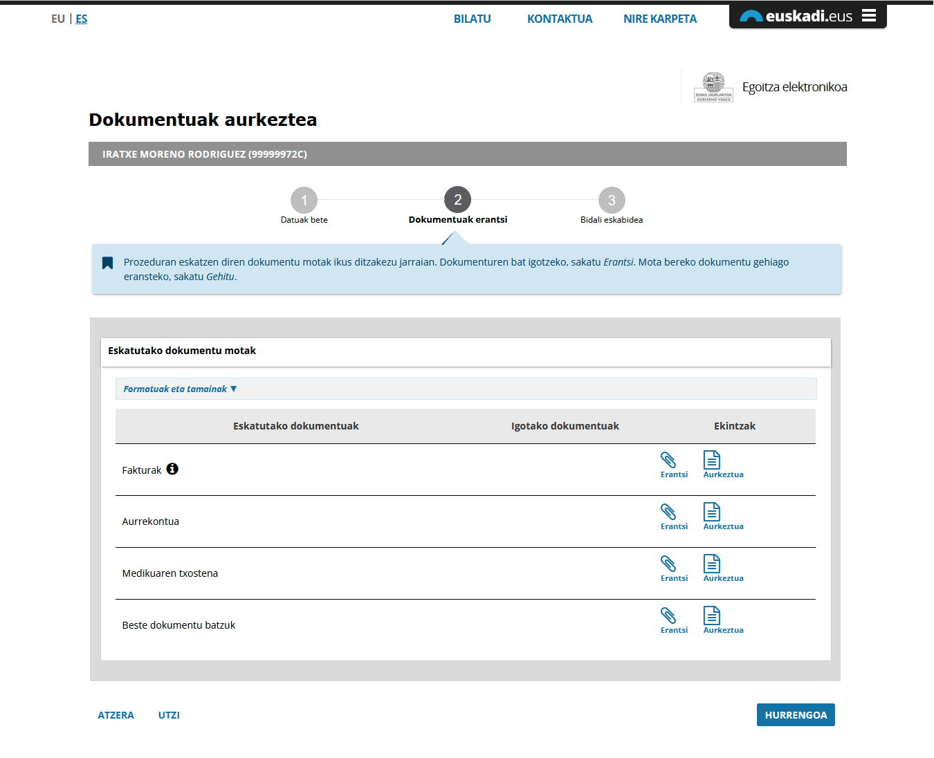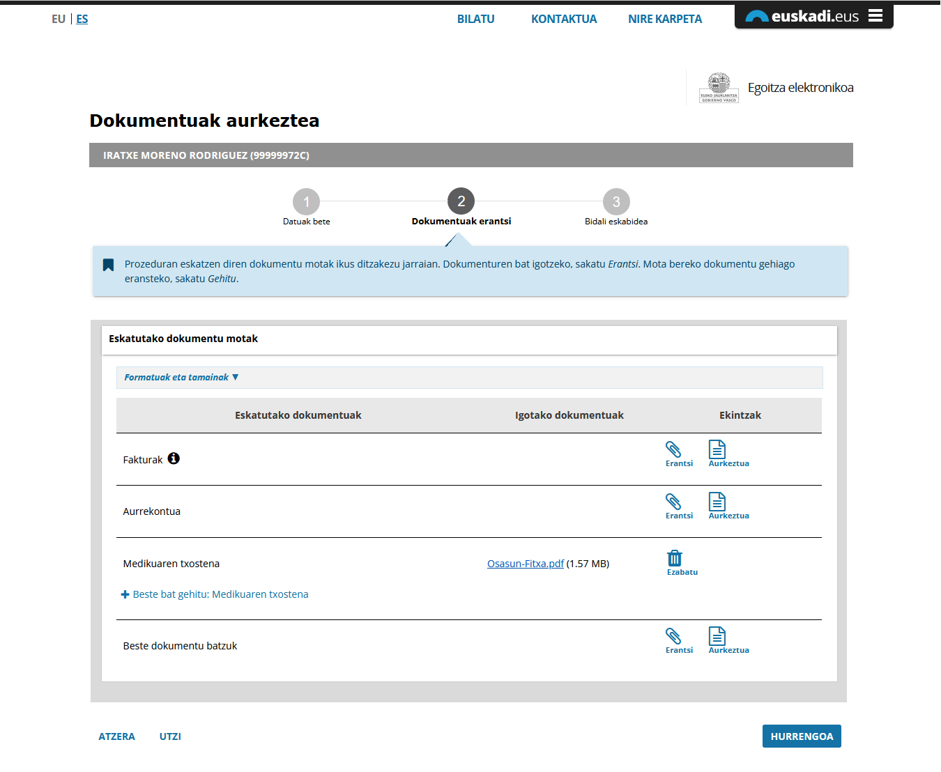 2. urratsean, "Dokumentuak erantsi", erantsi beharreko dokumentu moten zerrenda dator (Adibidean: fakturak, aurrenkontua, medikuaren txostena):