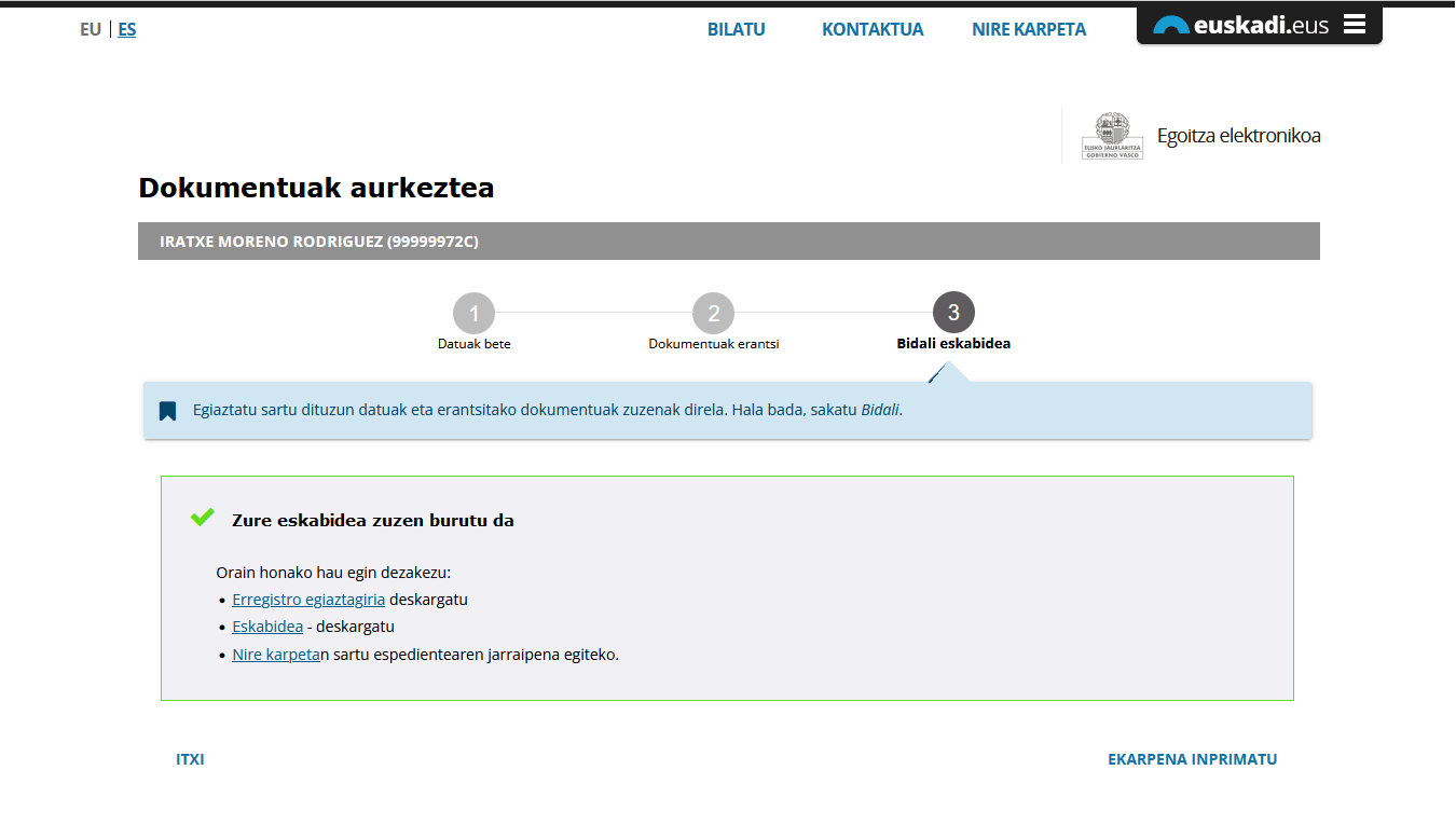 Ondoren, eskabidea ondo burutu delaren mezua agertuko da eta erregistro egiaztagiria eta eskabidea bera deskargatu ahal izango da.