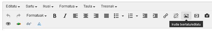 Irudiak (jpg, png, gif formatuetan) txerta ditzakegu gure edukian, "Irudia txertatu/editatu" aukeraren bidez. Horretarako, ohikoena irudia gure edukiaren "images" karpetara igotzea da: