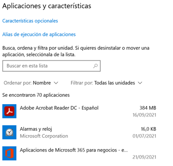 - Lo primero será introducir en la barra de búsqueda “Aplicaciones y características”. Aparecerá lo siguiente: