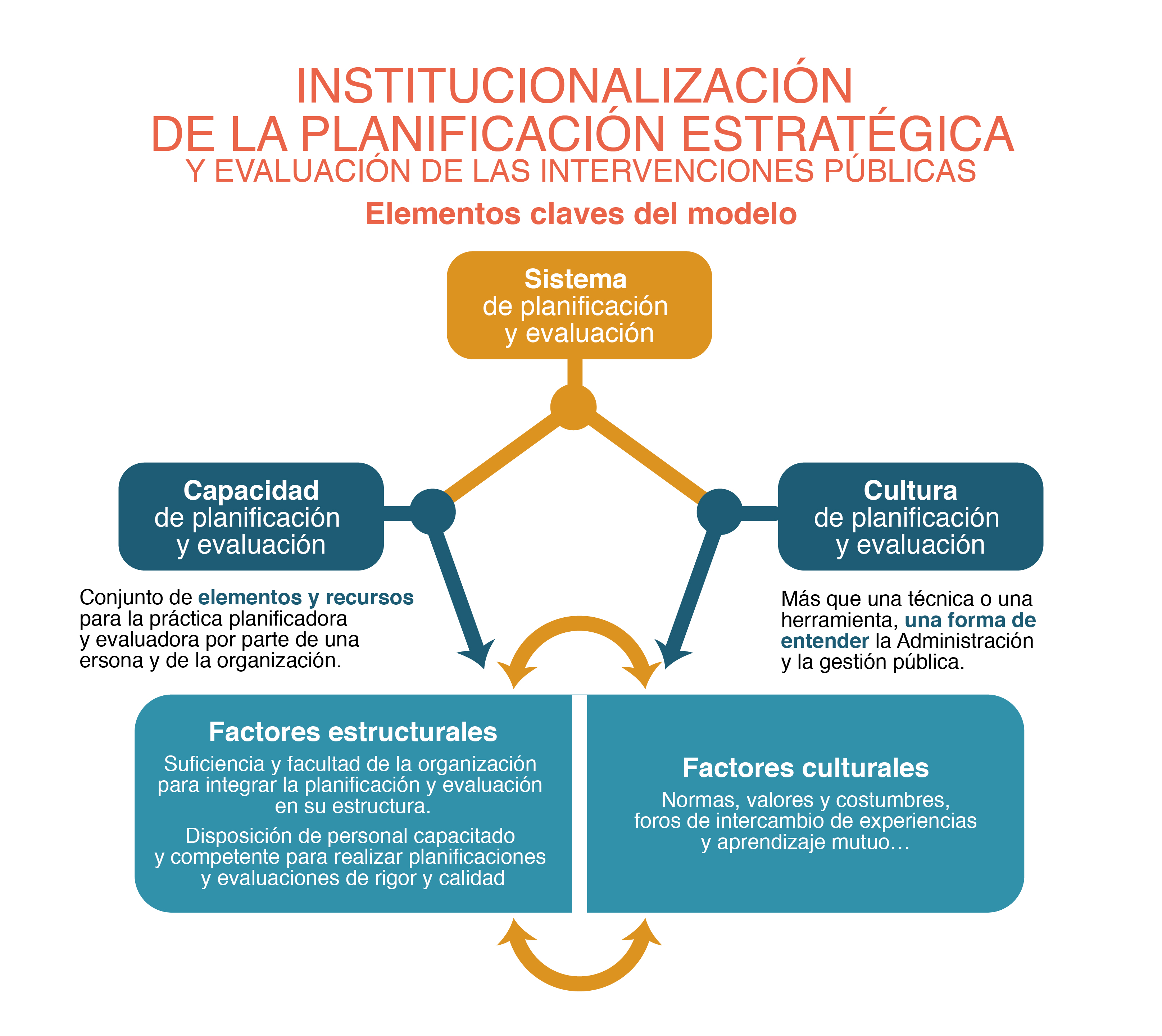 La institucionalización de la evaluación de las intervenciones públicas conlleva la definición y estructuración de espacios e instancias de las Administraciones a las que encargar la función de evaluación; configurar un modelo permanente de análisis que defina los principios y valores en los que sustentar la evaluación; definir recursos técnicos, normas, metodologías, etc. que hagan de la evaluación de tales intervenciones un proceso riguroso, transparente y de calidad, al servicio de los ciudadanos.