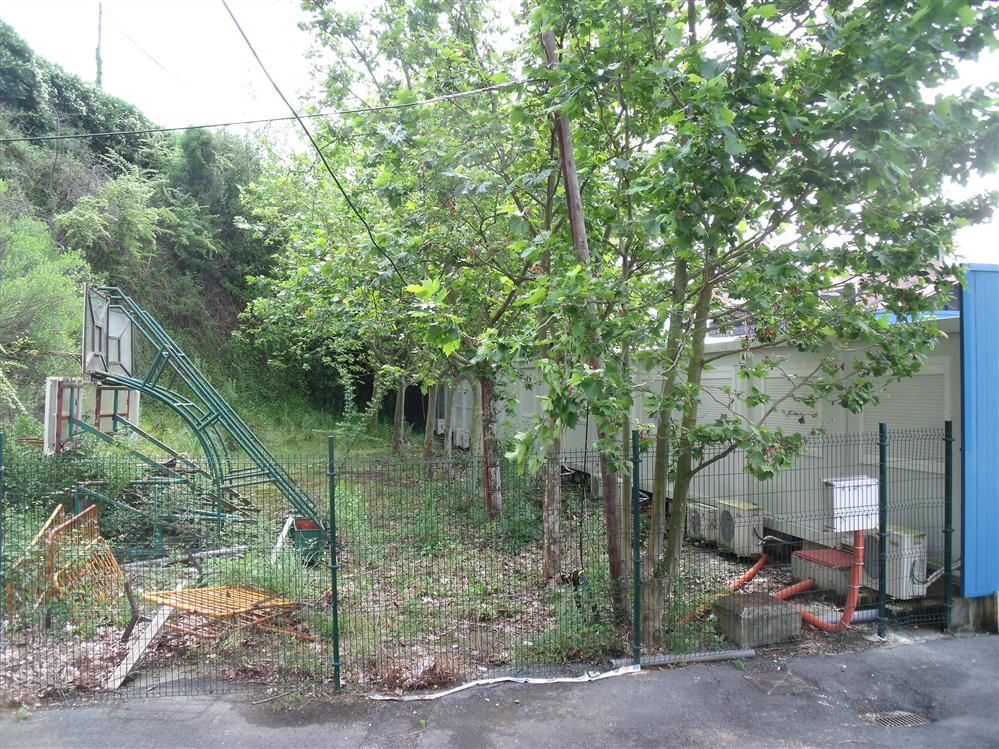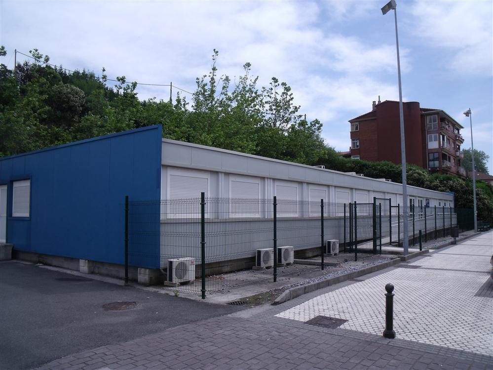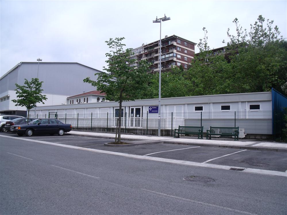 - Actualmente la pista alberga el edificio temporal del centro de salud. Este edificio ha estado en uso dos años (2010-2012). El mes pasado se dejó de utilizar (el centro de salud ha vuelto a pasar al edificio original recién rehabilitado). En el futuro, este espacio volverá a utilizarse como espacio deportivo. Se sitúa en el exterior del frontón Jostaldi. Todavía hay canastas y material deportivo detrás del edificio temporal.