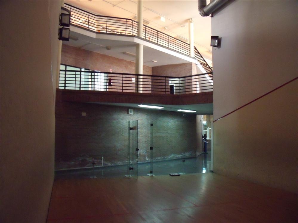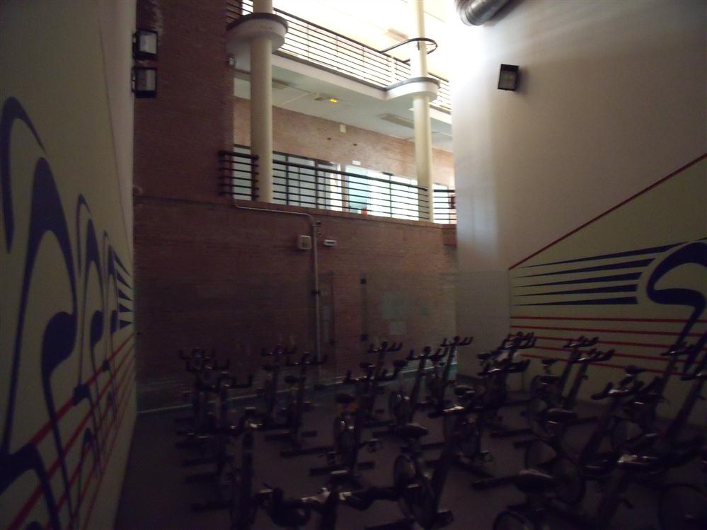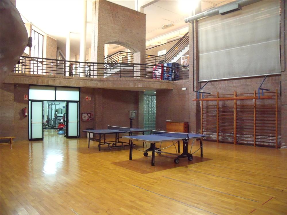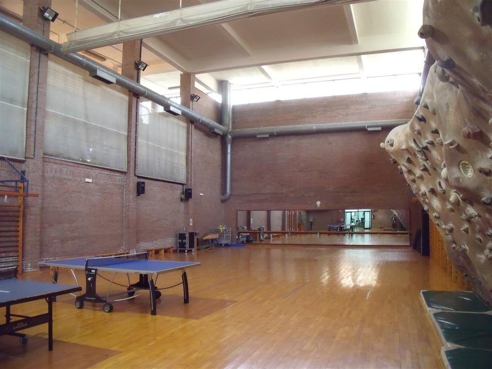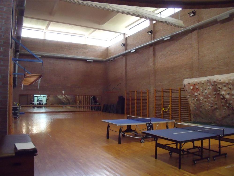 - La mitad del espacio se utiliza para aerobic. Se suele separar mediante cortinas. La otra mitad para tenis de mesa y bulder.
