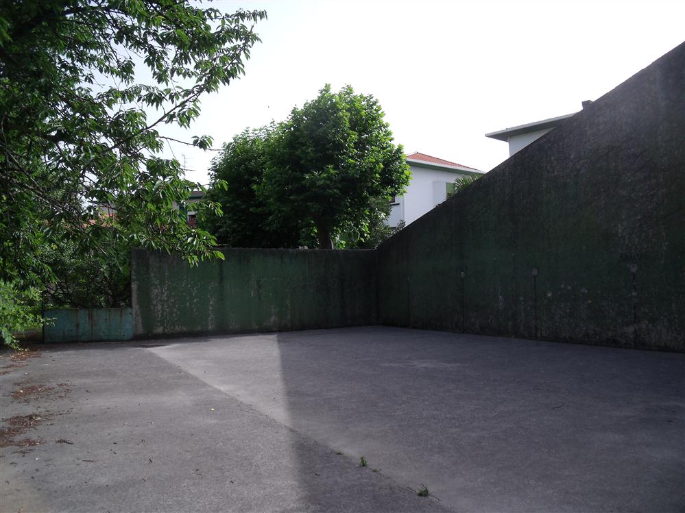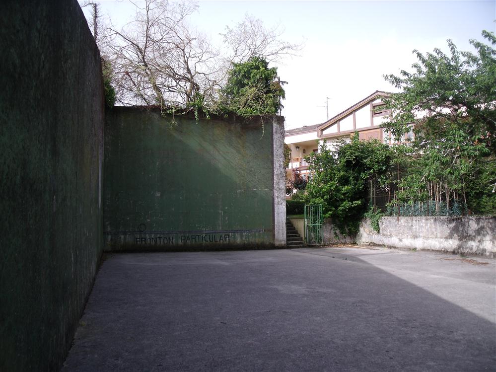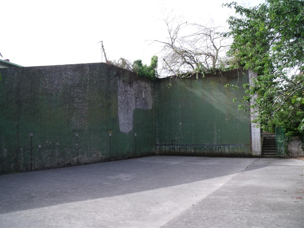 Frontón privado. Pared lateral deteriorado y con desprendimientos. Frontis en estado parecido. Presencia de vegetación. El pavimento permite practicar la pelota vasca.