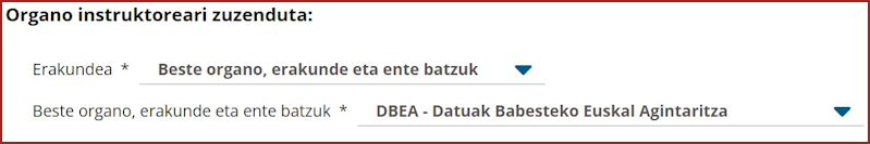 Formularioaren lehen urratsean, "Organo instruktoreari zuzenduta" dioen lekuan, "Erakundea" eta "Beste organo, erakunde eta ente batzuk" atalak DBEAren datuekin beteta egon behar dira, irudi honen arabera: