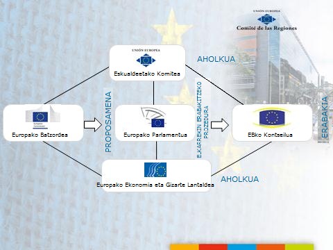 Euskadi kide aktiboa da Europako Eskualdeen Batzordean. Haren eginkizuna, funtsean, Batasuneko araudia hasierako fasean aztertzea da, nagusiki, Eusko Jaurlaritzako sailek eginiko zuzenketen bidez, eskualdeko eta tokiko interesei mesede egiten dion legeria ezartzeko.