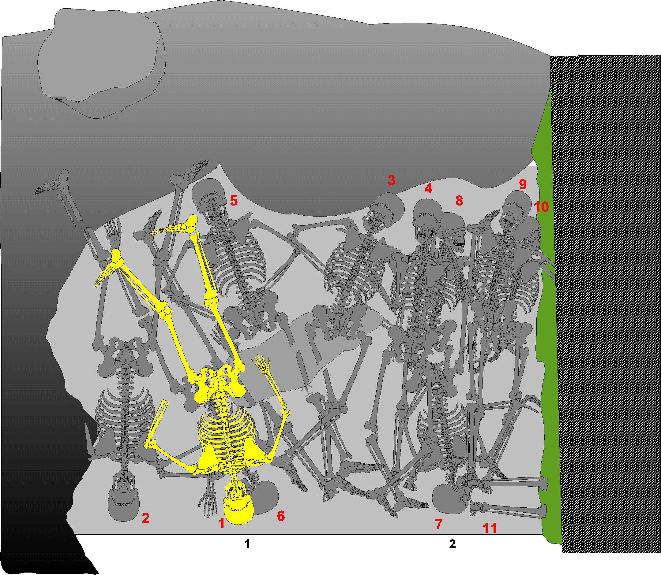 Hamar pertsona zeuden ahoz behera etzanda, txandaka. Nahita egin zela uste da, izan ere, hilotzak ez ziren kanposantura eraman, nahiz eta gertu egon, 300 metrora; horren ordez, hobia zabaldu eta gorpuak bertan buruz behera jartzea erabaki zen. 11. gizabanakoa ere buruz behera zegoen, perpendikularrean. Ezin da 12. gizabanakoaren kokapena zehaztu.