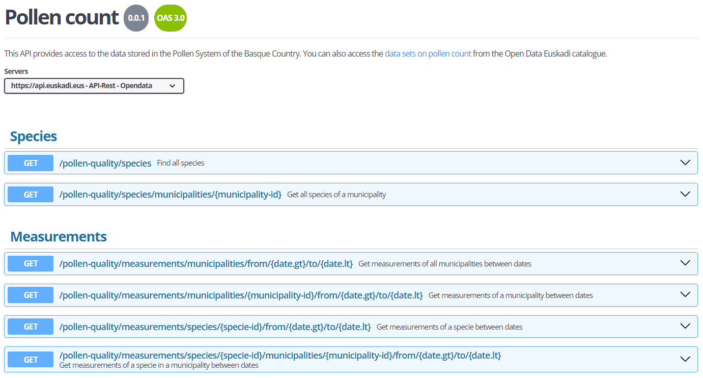 Orain arte, datuak Open Data Euskadi katalogoan eskuragarri zeuden datu-multzoak hainbat formatutan (Excel, CSV eta JSON) jeitsi zitezkeen. Hemendik aurrera, eskuragarri dago API Rest bat ere, estazio edo udalerri bakoitzeko eta polino-motaren araberako kontsultak egiteko aukera ematen duena.