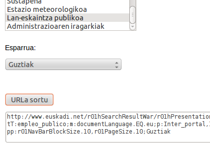 Adibidez, egin dezagun aproba bat informazio zehatz bat aurkitzeko. Lan eskaintza publikoen alorra aukeratu dezagun informazio motan, eta esparrua, badaezpada, guztiak izan dadila. URLa sorteko eman, eta helbide luze bat eratuko zaigu.