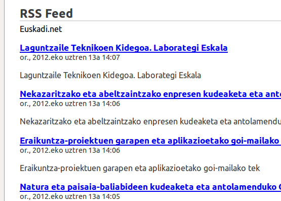 Demo orri edo adibideko baliabide praktiko txiki bat sortu dugu, Eusko Jaurlaritzak Euskadi.net atariaren bidez eskaintzen duen informazioaren bitartez. Bere garaian dokumentatu genuen nola informazio hori guztia irekia den, eta modu desberdinetan eskuratu daitekeen. Horietako bat RSS jarioen formatua da. Kontratuak, laguntzak… Jaurlaritzaren sail eta lan-esparru bakoitzean berezituta: aldagai askoren arabera findu daiteke RSS zehatz bakoitzaren parametro multzoa.