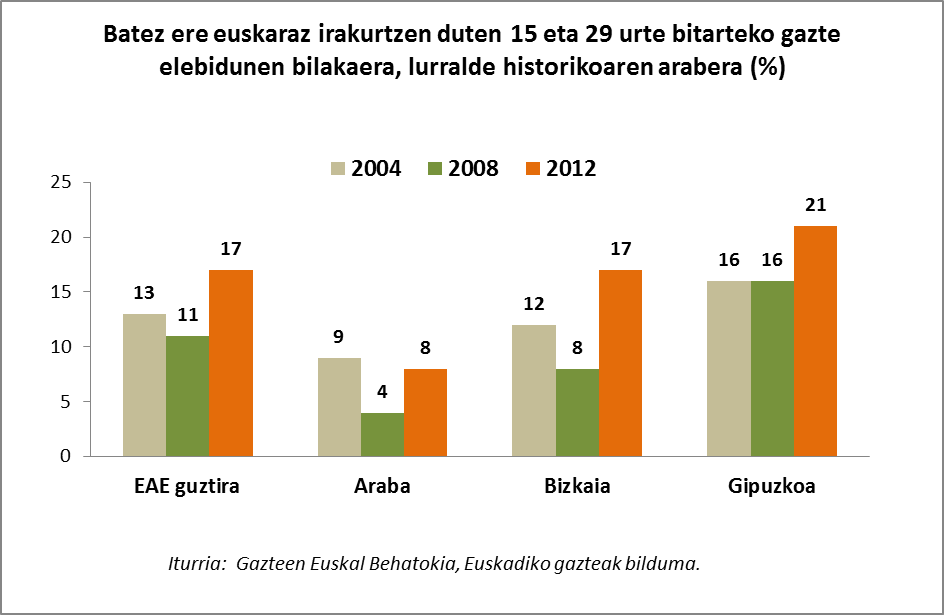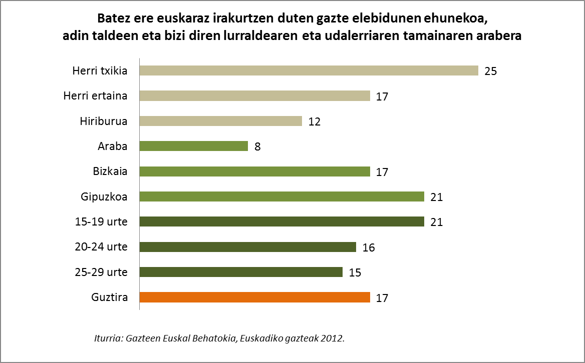 Euskadiko gazteak bildumaren azken txostenak aditzera ematen duenez, euskaraz ondo edo oso ondo irakurtzen duten gazteen % 17k batez ere euskaraz irakurtzen dute, % 24k neurri berdinean euskaraz zein gazteleraz, eta % 56k batez ere gazteleraz. Txosten horiek lau urtean behin burutzen ditu Gazteen Euskal Behatokiak.