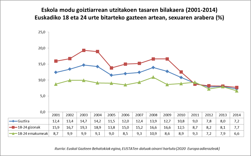 Eskola modu goiztiarrean utzitakoen tasak behera egin du poliki-poliki azken urteetan 2014an % 7,2 izan arte. Tasa hau zertxobait altuagoa da gizonen artean (% 7,7) nesken artean baino (% 6,6). Aldea azken urteetan murriztu da, batez ere gizonen tasak behera egin duelako. Izan ere, 2004an nesken tasa bikoizten zuen.