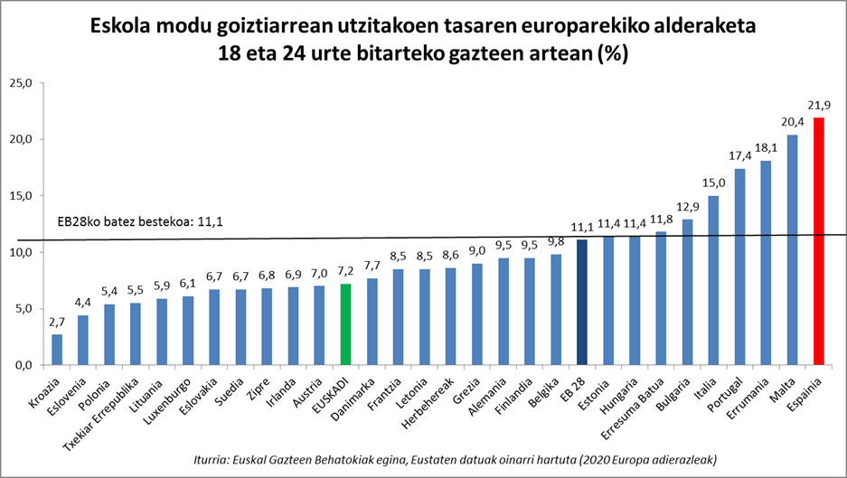 Europar Batasuneko 28 herrialdeen datuei erreparatzen badiegu, Euskadi Europako batez bestekoaren azpitik kokatzen dela ikus dezakegu (% 11,1). Espainiak, aldiz, eskola modu goiztiarrean utzitakoen tasarik altuena du Europan (% 21,9).