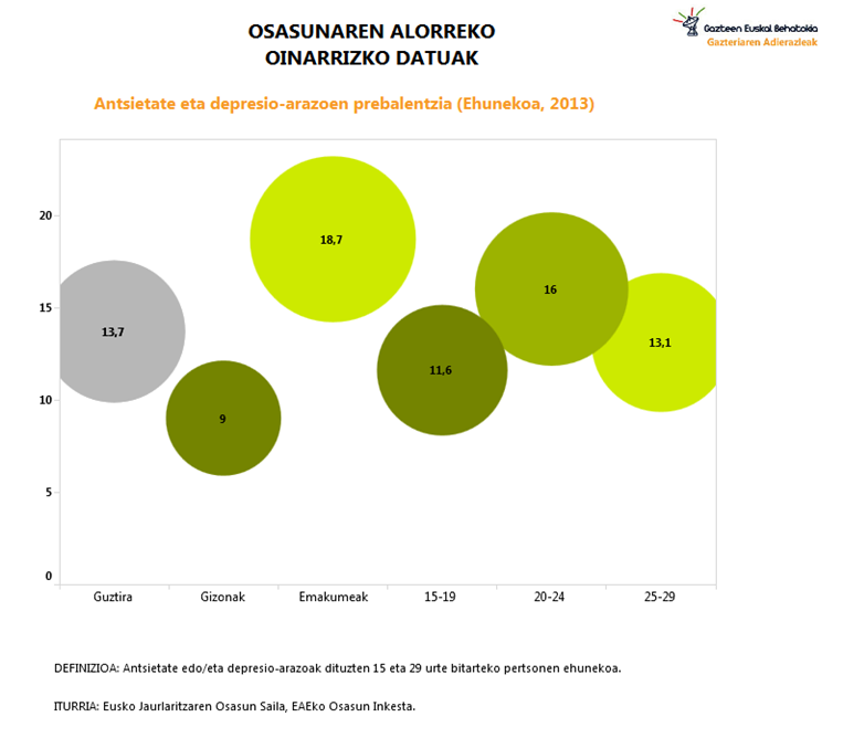 Eusko Jaurlaritzako Osasun Sailak 2013an eginiko Euskal Osasun Inkestatik (2013ko EAEOI) hartutako datuen arabera, Euskadiko 15 eta 29 urte bitarteko gazteen % 13,7k antsietate edo depresio arazoren bat izan zuten inkesta egin aurreko lau asteetan.
