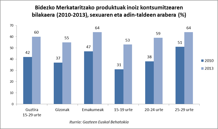 Zehaztu beharra dago ehuneko horiek ez direla horren altuak, Bidezko Merkataritzako produktuak kontsumitu ohi dituztenei erreparatzen badiegu. Gazteen % 7k sarri erosten dituzte Bidezko Merkataritzako produktuak. Alabaina, goranzko joera antzeman daiteke Bidezko Merkataritzako produktuak sarri erosten dituztenen ehunekoan, izan ere, 2010ean gazteen % 4 baino ez ziren.