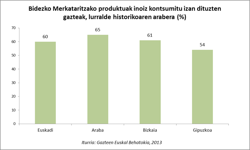Datuak lurralde historikoen arabera aztertuta, horrelako produktuak noizbait kontsumitu izan dituztenen ehunekorik altuen duen lurraldea Araba da. Jarraian, Bizkaia dator (% 61) eta, azkenik, Gipuzkoa (% 54).