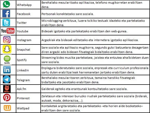Datu horiek lortzeko, sare sozialen zerrenda bat aurkeztu zaie gazteei (besteak beste, zenbait aplikazio mugikor), eta galdetu zaie horiek guztiak nolako maiztasunarekin erabiltzen dituzten. Proposatutako sare sozialak hauek izan dira:
