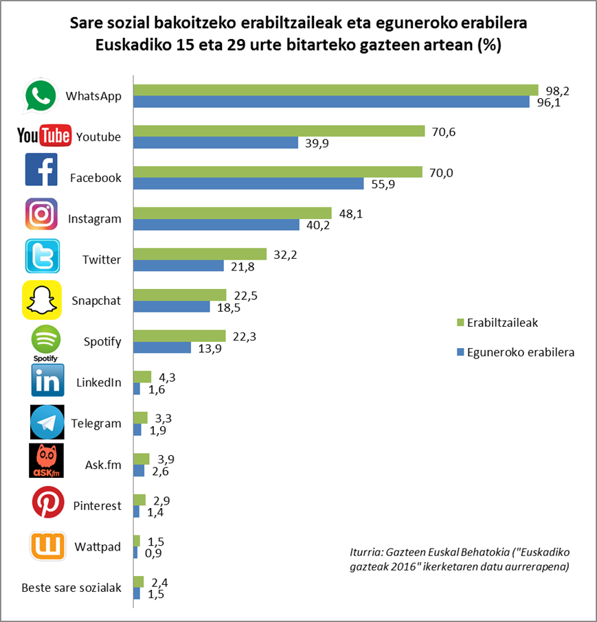 - Euskadiko gazteak gehien konektatzen diren sare sozialak WhatsApp, Facebook, Instagram eta Youtube dira