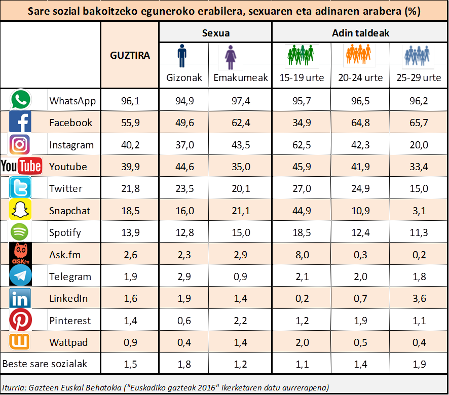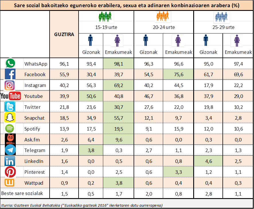 15 eta 19 urte bitarteko neskak dira sare sozialen “kontsumitzaile” nagusiak, proposatutako hamabi sare sozialetik zazpitan dituzte konekzio portzentajerik altuenak: WhatsApp, Instagram, Snapchat, Twitter, Spotify, Ask.fm eta Wattpad (eguneroko konekzio portzentajerik altuenetatik baxuenetara).