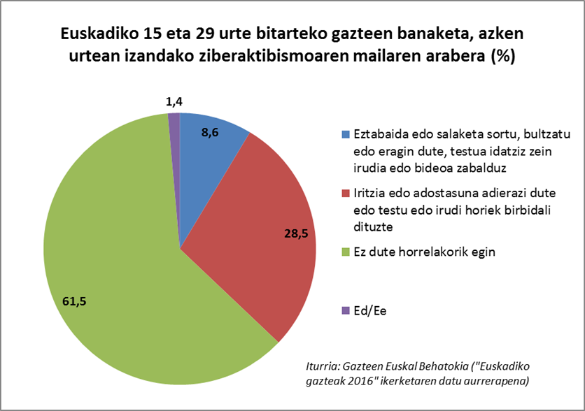 Iazko urtean zehar, Euskadiko gazteen heren batek baino gehiagok (% 37,1) baliatu zituen sare sozialak eztabaidaren bat sustatzeko, egoeraren bat salatzeko, gai baten alde agertzeko edo horri buruzko iritzia emateko.