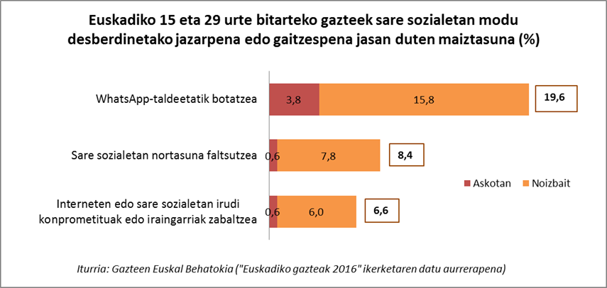 - Iazko urtean, gazteen heren batek baino gehiagok baliatu zituen sare sozialak eztabaidak edo salaketak sustatzeko edo zabaltzeko