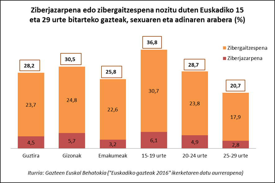 Definizio horiek kontuan hartuta, hau adieraz dezakegu: Euskadiko gazteen % 4,5ek ziberjazarpen-egoeraren bat nozitu du, eta % 23,7k, berriz, zibergaitzespen-egoeraren bat. Guztira, gazteen % 28,2k pertsonalki bizi izan du sare sozialetan gaitzespen- edo jazarpen-egoeraren bat.