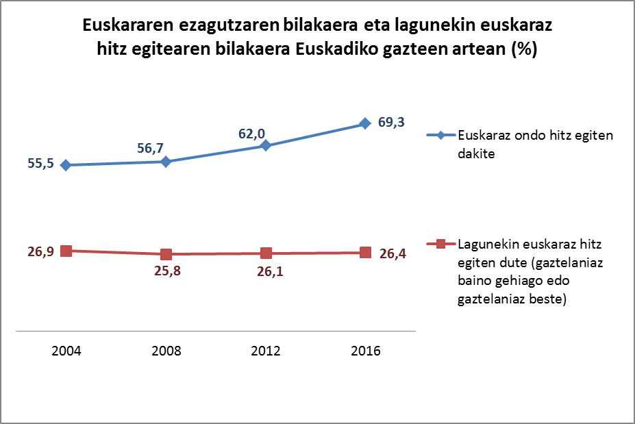 2016 urtearen hasieran Euskadiko 15 eta 29 urte bitarteko 1500 gazteri galdetu genien euskaraz hitz egiten zekiten bai eta lagunekin zein hizkuntzatan hitz egiten zuten ere. Emandako erantzunen arabera, gazteen % 26,4k euskara erabiltzen dute, gaztelania baino gehiago edo gaztelania beste, lagunekin erlazionatzean (portzentaje horretan dauzkagu beti euskaraz hitz egiten dutenak, euskaraz gaztelaniaz baino gehiagotan hitz egiten dutenak eta hizkuntza biak parean erabiltzen dituztenak).