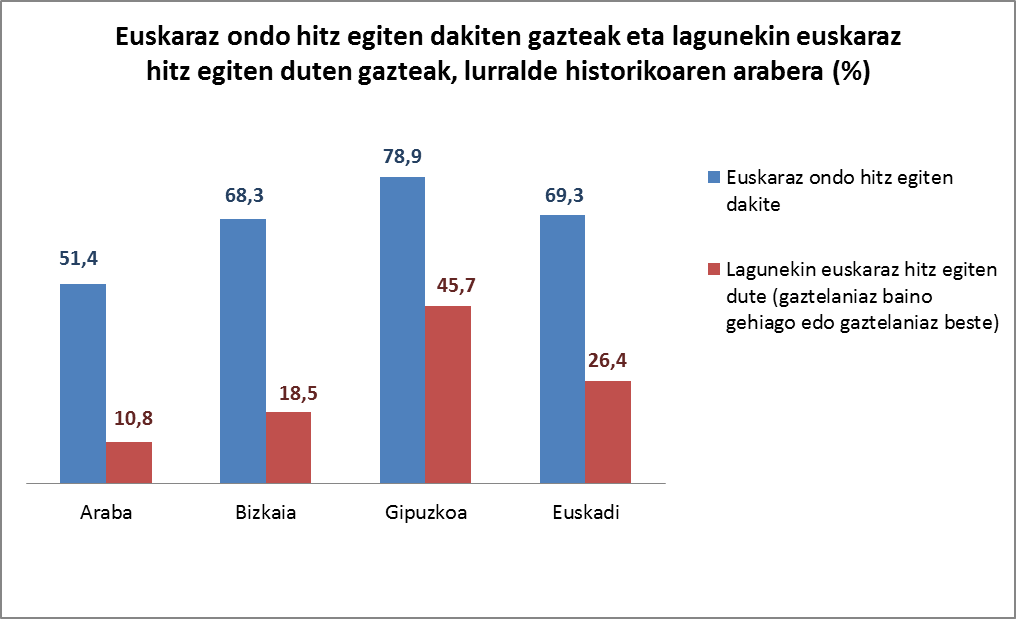 Kontuan izan behar da Gipuzkoan euskaraz ondo hitz egiten dakiten gazteak beste lurraldeetan baino gehiago direla: % 78,9 Gipuzkoan, % 68,3 Bizkaian eta % 51,4 Araban. Hala ere, ezagutzan hautematen diren aldeak eta erabileran ikusten direnak ez dira parekoak.