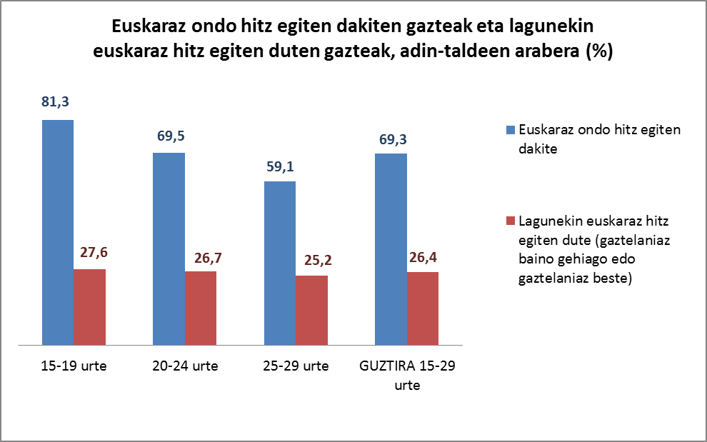 Baina lagunekin euskaraz hitz egiten dutenen ehunekoa antzekoa da hiru adin-taldeetan: % 27,6koa da 15 eta 19 urte bitartekoen artean, % 26,7koa 20 eta 24 urte arte dutenen artean eta % 25,2koa 25 eta 29 urte bitartekoen taldean.