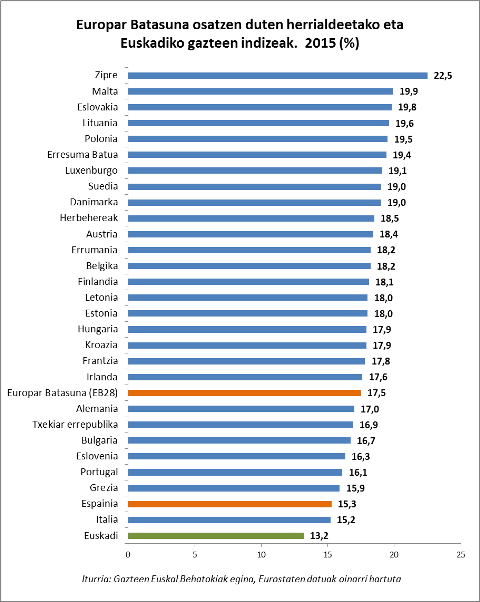 Bestalde, konparatzen baditugu Euskadiko gazteen indizea eta Europar Batasuna osatzen duten 28 herrialdeetakoak, berriro ere ikusten dugu Euskadikoa baxuagoa dela. Europar Batasuneko batez besteko indizea % 17,5ekoa da.