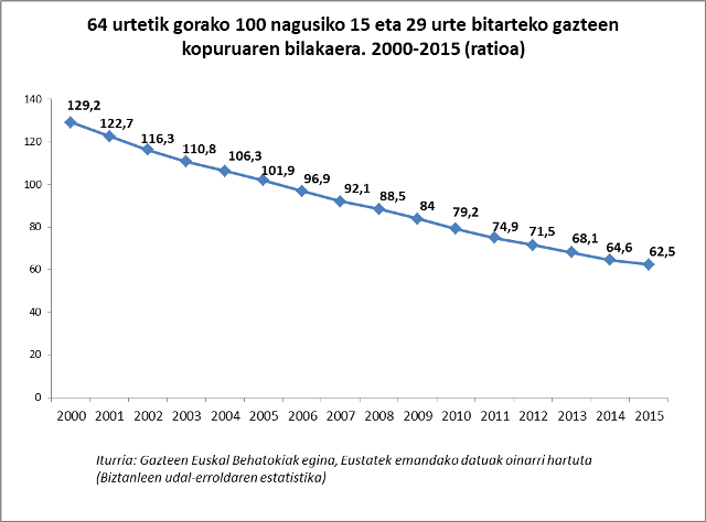 Adierazle honen bilakaera deigarria da: 2000 urtean 64 urtetik gorako 100 nagusiko 129,2 gazte zeuden, 2015ean (hau da, hamabost urte beranduago) horien erdiak baino gutxiago (62,5).