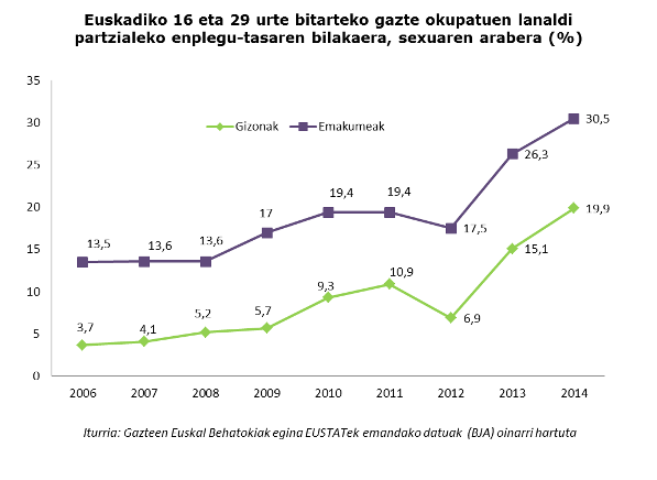 EUSTATeko Biztanleria Jardueraren Arabera (BJA) izeneko inkestaren azken datuek esaten dute 16 eta 29 urte bitarteko emakumeek gizonek baino enplegu-tasa handixeagoa dutela (% 39,6ko okupazio-tasa dute emakumeek eta gizonek % 36,7koa). Hala ere, lanaldi partzialeko enplegu portzentajea emakumeen artean 10 puntu altuagoa da.
