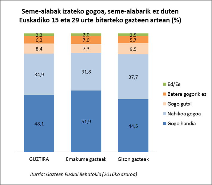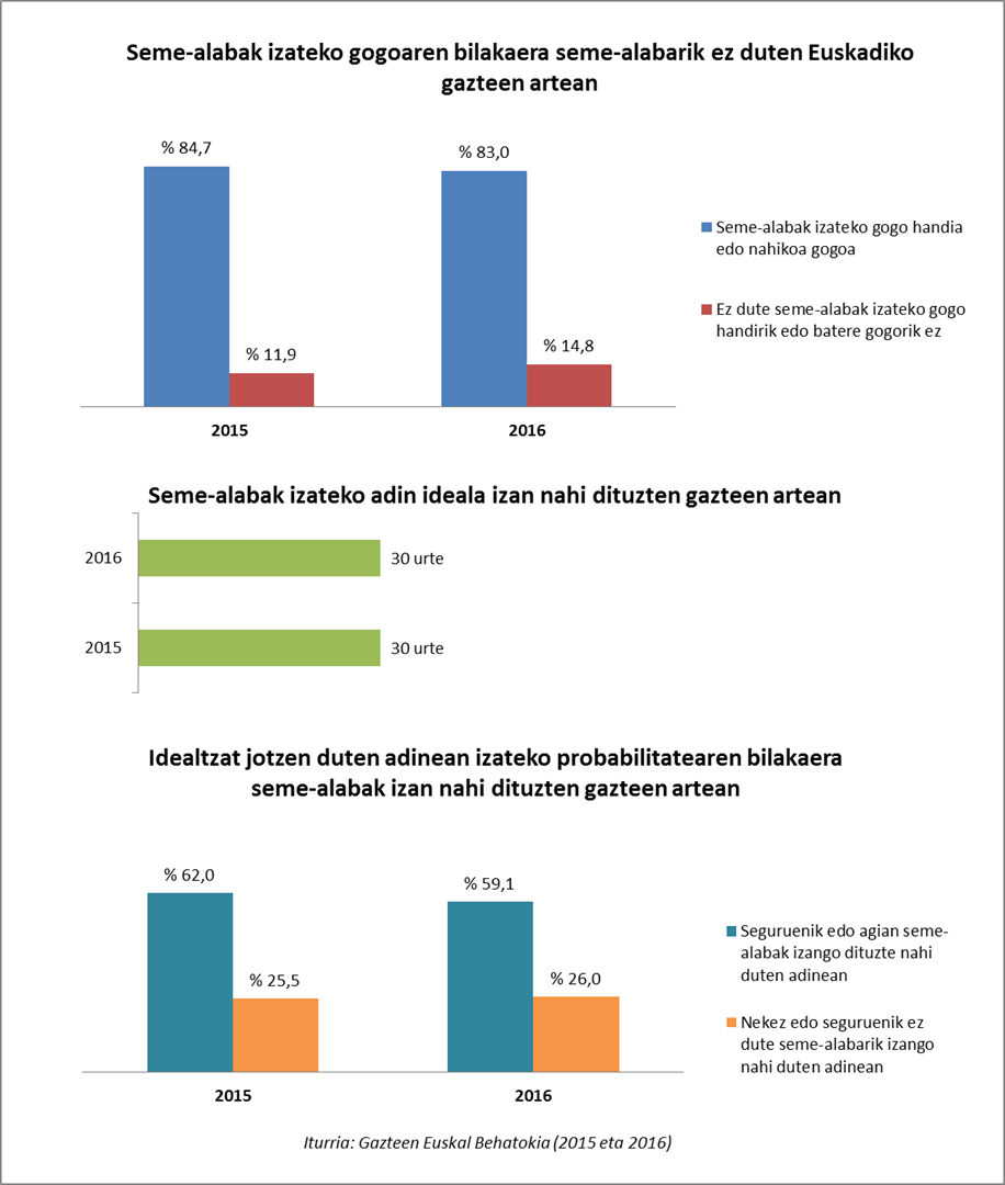 Datu hauek aurreko urtean jasotakoekin konparatuz gero, ikusi ahal dugu gazteen gogoak eta aurreikuspenak antzekoak direla. 2015 urtearen bukaeran seme-alabarik ez zuten gazteen % 84,7k seme-alabak izatea gustuko luketela adierazi zuten; gazte horiek horretarako jotzen zuten adin ideala 30 urte ziren, batez beste, mutilen artean eta 29 urte nesken artean; eta seme-alabak izan nahiko zituztela azaldu zutenen laurden batek (% 25,5) ezin izango zuela adin horretan izatea pentsatzen zuen.