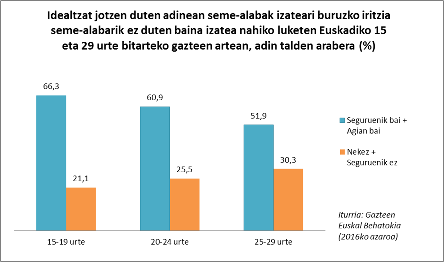 Gazteek idealtzat jotzen duten adin hori Euskadin benetan lehenengo seme-alaba izaten den adinaren azpitik dago. INEk (Instituto Nacional de Estadística) ematen dituen datuen arabera, Euskadin emakumeek, batez beste, 32 urterekin izaten dute lehenengo seme-alaba, hau da, emakumeek nahiko luketen baino hiru urte beranduago (datu hori Gazteen Euskal Behatokiak egin duen Euskadiko gazteen panoramika. Gazteen adierazleak 2015 izeneko txostenean kontsulta daiteke).