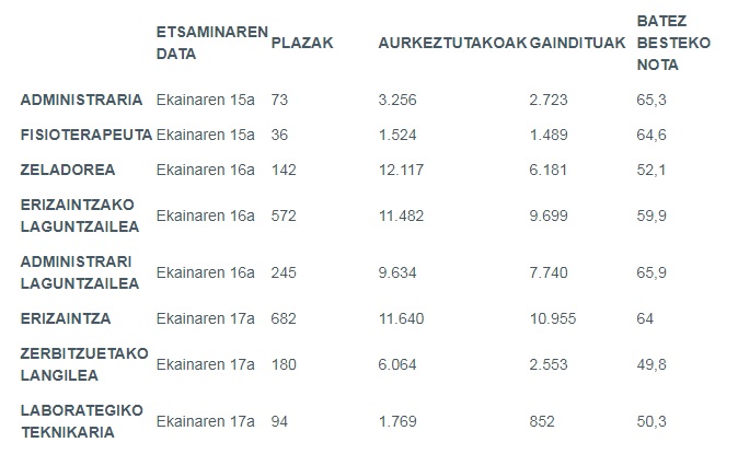 Asteburu honetan, gainera, ondorengoen etsaminak egin dira: fisioterapeuta (1.866 onartu), administraria (4.686 onartu), eta laborategiko teknikari espezialista (2.170 onartu). EPE honetara aurkezten diren pertsonen ia % 80k ostiral, larunbat eta igande honetan egin dituzte probak. Gainditutakoen kopurua kategoriaka honela banatzen da: