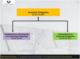 Egitura modularra du masterrak, eta horrek posible egiten du urtebetean edo bitan egitea. Arreta goiztiarreko master honek hiru titulu izateko aukera ematen du: Unibertsitateko aditua, Espezializazio unibertsitarioa edo Masterra, arlo honetako trebakuntza errazteko eta ikasle profil ezberdinetara eta hauen ordutegi-aukeretara moldatzeko