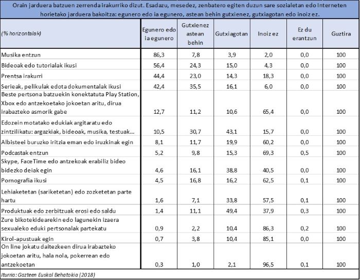 Internet eta sare sozialetan jarduera ohikoenak (inkestatuei planteatu zitzaien zerrenda batetik hautatuta) musika entzutea eta bideo edo tutorialak ikustea dira. Gazte gehienak egunero aritzen dira jarduera bietan (% 86,3k egunero entzuten du musika, eta % 56,4k egunero ikusten du bideoren bat). Badira gazte gehienek egiten dituzten jarduera mota batzuk, baina erdia baino gutxiago dira horietan egunero aritzen direnak. Horien artean daude serieak edo pelikulak ikustea, prentsa irakurtzea, edozein motatako edukiak (argazkiak, bideoak, testuak...) argitaratzea, produktu edo zerbitzuak erosi edo saltzea, eta Skype, FaceTime edo antzeko plataformak erabiliz bideodeiak egitea.