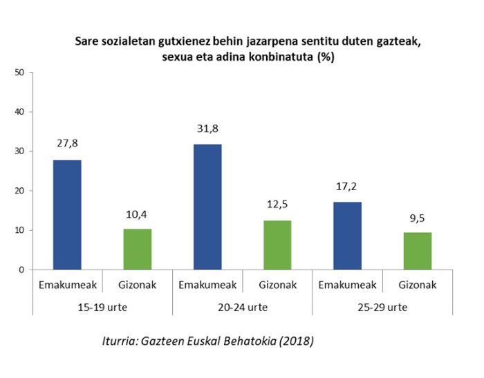 Gainera, gazteen % 17,9k dio noizbait sentitu izan duela norbaiten jazarpena etengabe mezuak bidaltzen zizkiolako, iruzkin desatseginak bidaltzen zizkiolako edo sare sozialen bitartez iraintzen zuelako. Eta jazarpenik sentitu ez badu ere, Euskadiko gazteen erdiak baino zertxobait gehiagok (% 52,4k) dio gutxienez behin irten izan dela sare sozialen batetik edo blokeatu izan duela norbait, haren mezu desatseginik ez jasotzeko.
