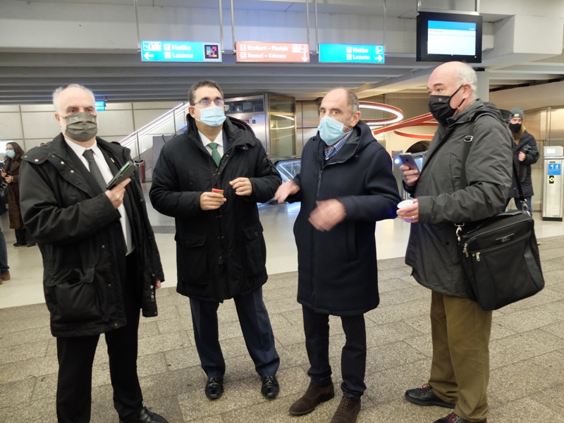 Ernesto Martinez de Cabredo ETSko zuzendari nagusia eta Eneko Arruebarrena Metro Bilbaokoa eta Juan Carlos Andueza ONCE Euskadiko lurralde-ordezkaria bertan izan dira gaur goizean. ETSko eta Metro Bilbaoko langileak, telefono mugikorra eta aplikazio hori zutela, metroaren 1-2. eta 3. lineetako hainbat puntutan ibili dira gailuaren eraginkortasuna egiaztatzeko.