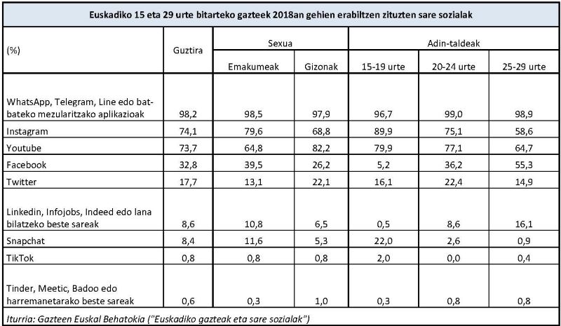 2018an gazteek gehien erabiltzen zituzten sare sozialak Instagram eta Youtube ziren, eta atzetik zetozen Facebook, Twitter, lana bilatzeko sareak, hala nola, Linkedin, Infojobs, Indeed.., bai eta Snapchat ere.