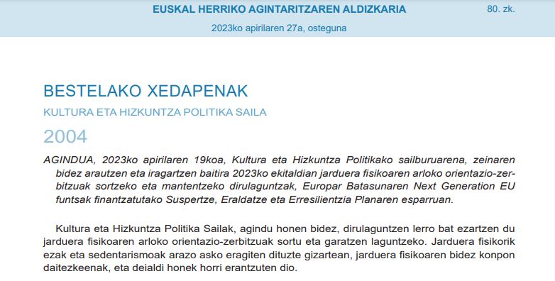 AGINDUA, 2023ko apirilaren 19koa, Kultura eta Hizkuntza Politikako sailburuarena, zeinaren bidez arautzen eta iragartzen baitira 2023ko ekitaldian jarduera fisikoaren arloko orientazio-zerbitzuak sortzeko eta mantentzeko dirulaguntzak, Europar Batasunaren Next Generation EU funtsak finantzatutako Suspertze, Eraldatze eta Erresilientzia Planaren esparruan.