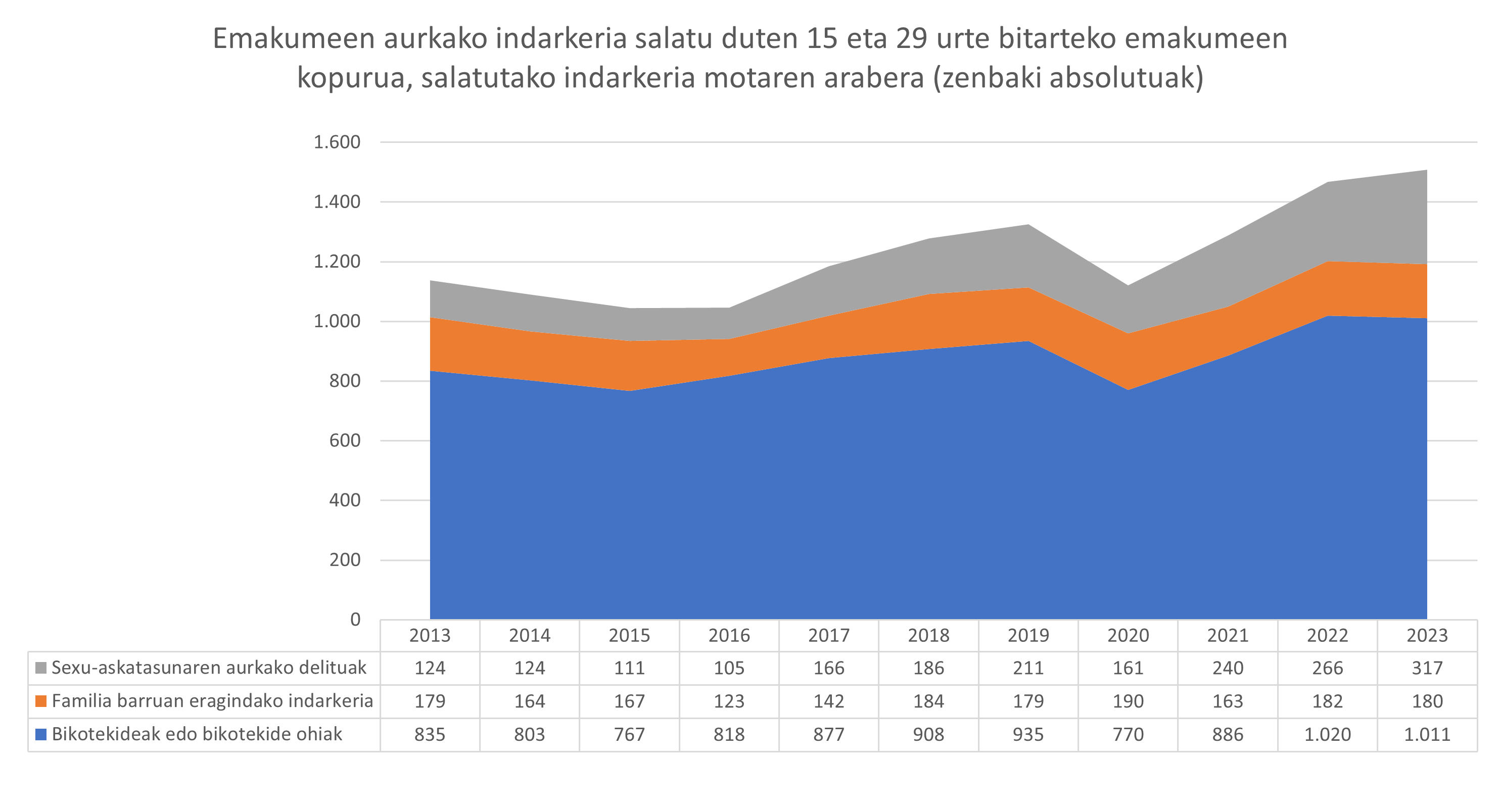 Datu horien arabera, (erregistratutako emakumeen eta emakumeen aurkako indarkeriaren salaketen kopuruaren berri ematen dutenak), 2023an, 5.235 emakume izan ziren indarkeria matxistaren biktima Euskadin. Horietatik 1.508 ziren 15 eta 29 urte bitarteko emakumeak. Etxez etxeko konfinamenduak eragindako 2020ko salaketen beherakadaren ondoren, zifra hori handituz joan da urtez urte, egungo baliora igo arte.