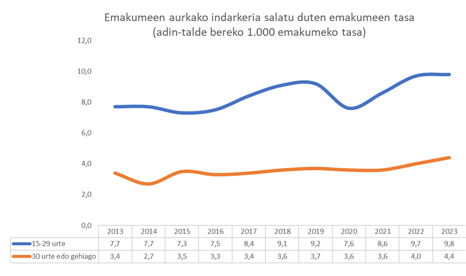 2023an, Euskadiko 15-29 urteko 1.508 emakumek salatu zuten emakumeen aurkako indarkeria, Segurtasun Sailaren datuen arabera