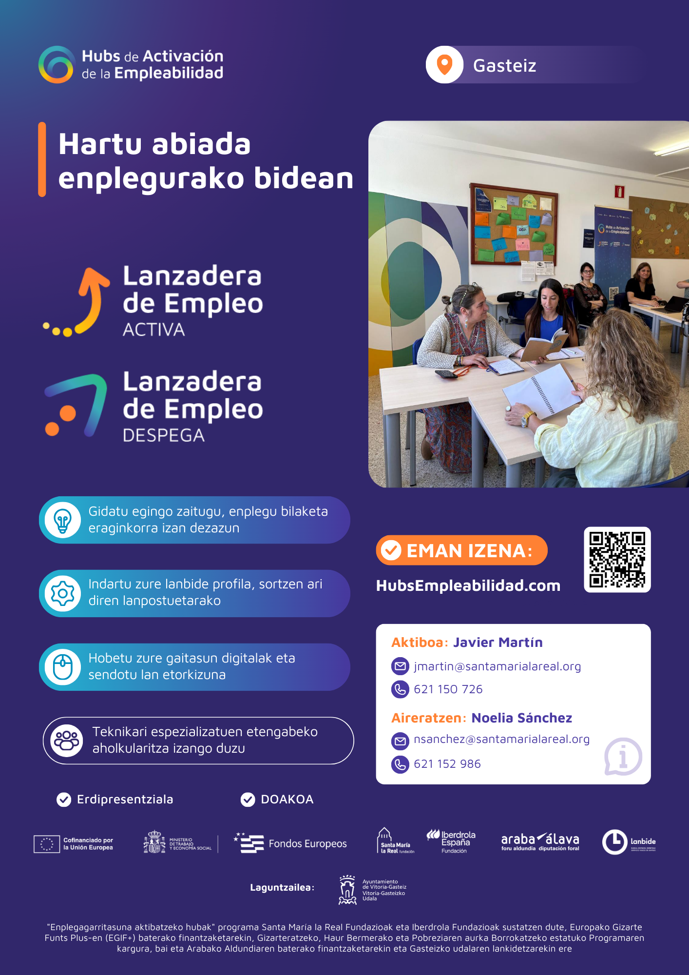 "Enplegagarritasuna Aktibatzeko Hubs" Santa María la Real Fundazioak eta Iberdrola España Fundazioak bultzatzen dute, Europako Plus Gizarte Funtsaren (FSE+) kofinantzaketarekin, Gizarteratzeko, Haur Bermerako eta Pobreziaren aurkako Borrokarako Estatuko Programaren kontura; eta Arabako Foru Aldundiaren kofinantzaketa eta Laudioko eta Gasteizko udalen lankidetza ere jasotzen ditu.